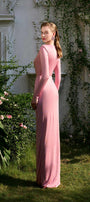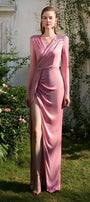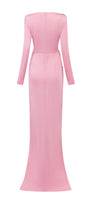 Expertly crafted with a modern slit v-neck, the dress is a stunning floor-length jersey gown. Its sleek silhouette is perfect for any formal occasion, providing both style and comfort. Elevate your look with this elegant and versatile piece.