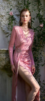 Embellished crystals on the shoulder and waist, Surplice design, High side slit, Square shoulder