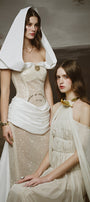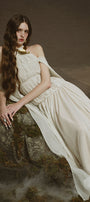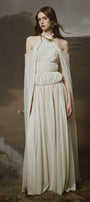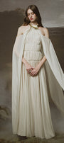 Undetachable cape sleeves, Elastic ruching bodice, Large band halter neck, Cut-out shoulder