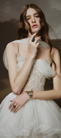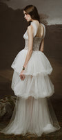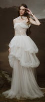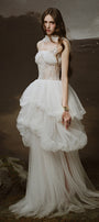 Special Features: Asymmetrical bubble layered tulle skirt, Tulle cover chest connect with neck and shoulder, Embellished sequin corset , Spaghetti straps