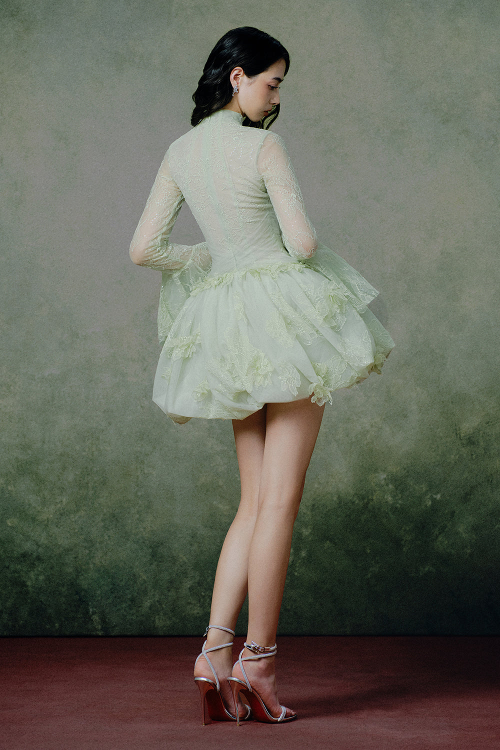 Elevate your look with this mini bubble dress featuring a sophisticated high neck, dramatic bell sleeves, and exquisite ruffle and embroidery detailing. Expertly crafted for a modern, polished silhouette, it is perfect for cocktail parties, evening events, or any special occasion where you want to stand out.
