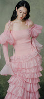 Embrace elegance in this sheath maxi dress, featuring an off-shoulder neckline, puff sleeves, delicate shirring, and ruffle embellishments. Expertly crafted for a refined silhouette, it is perfect for weddings, formal events, or special celebrations.