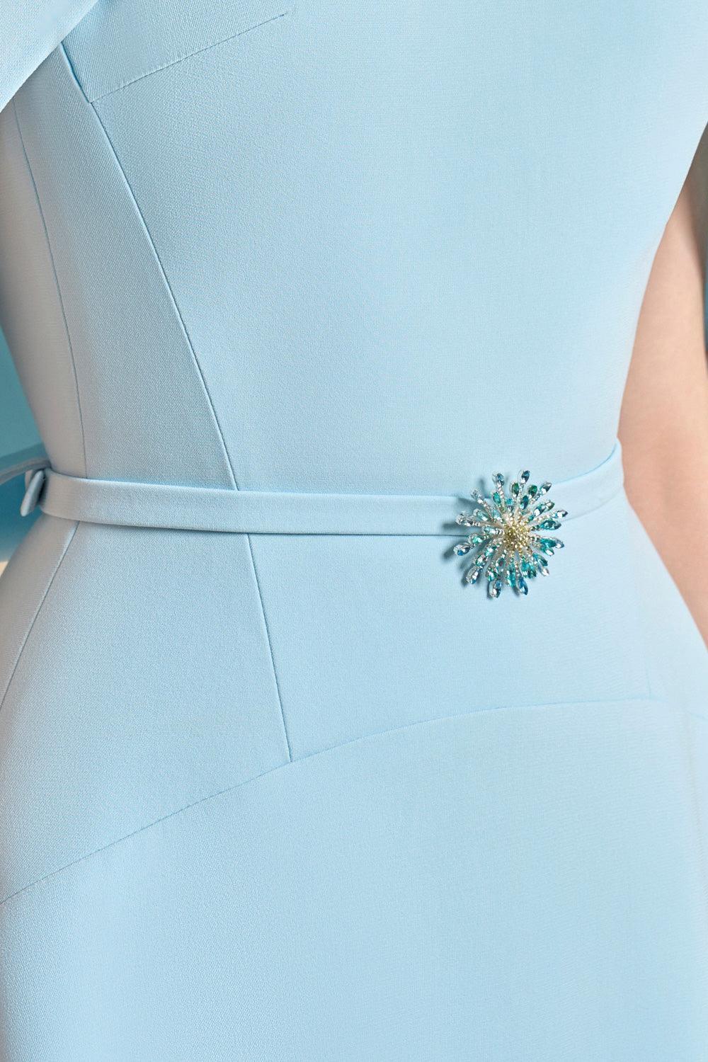 Special Features: Split cape at the back, Pleated neckline with stone buttons, Draped