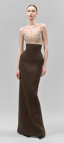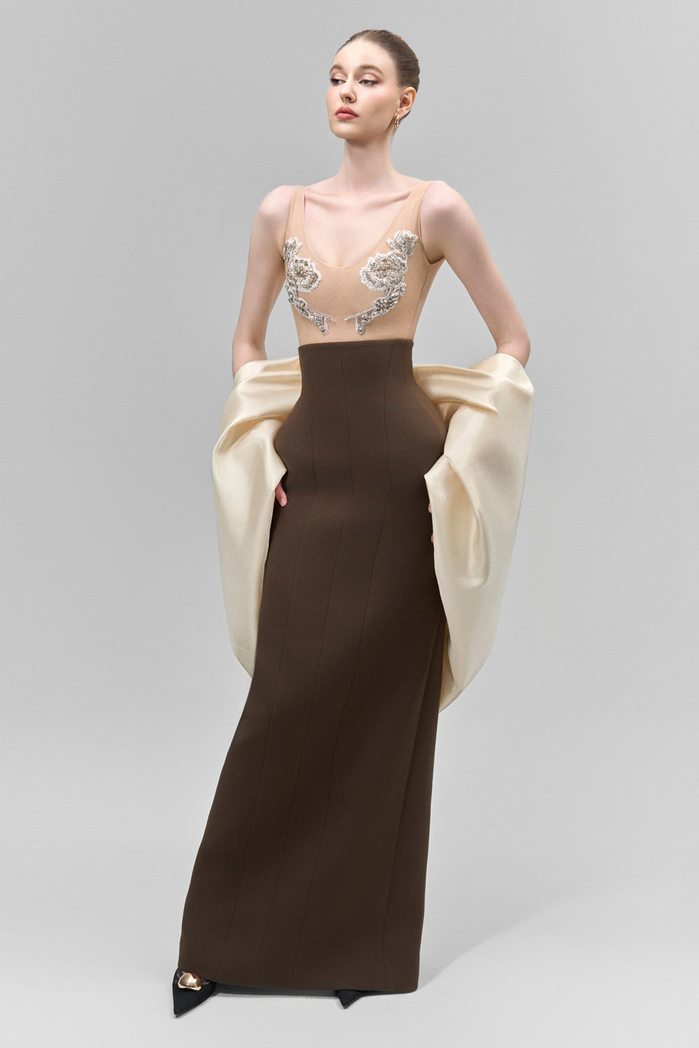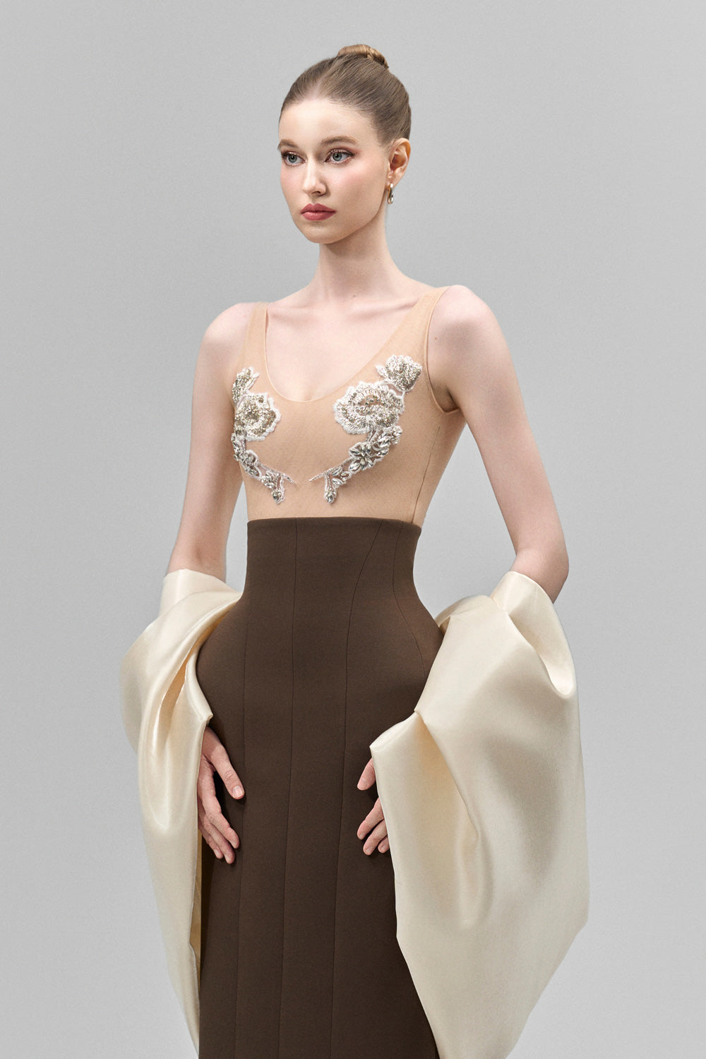 The bodysuit combines a flattering scoop neckline with delicate chest embroidery, offering a refined yet sensual aesthetic. Crafted from sheer mesh fabric, it contours the body seamlessly while the intricate embroidery adds a sophisticated focal point. Perfect for layering or wearing alone, this bodysuit balances elegance with modern edge for versatile styling.