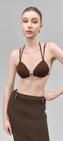 The bralette features delicate spaghetti straps designed for a minimal, lightweight fit. A metal pin detail at the center adds a refined, contemporary touch, enhancing both style and structure. Crafted from soft jersey fabric, this bralette offers breathable comfort while maintaining a sleek silhouette perfect for layering or wearing alone.