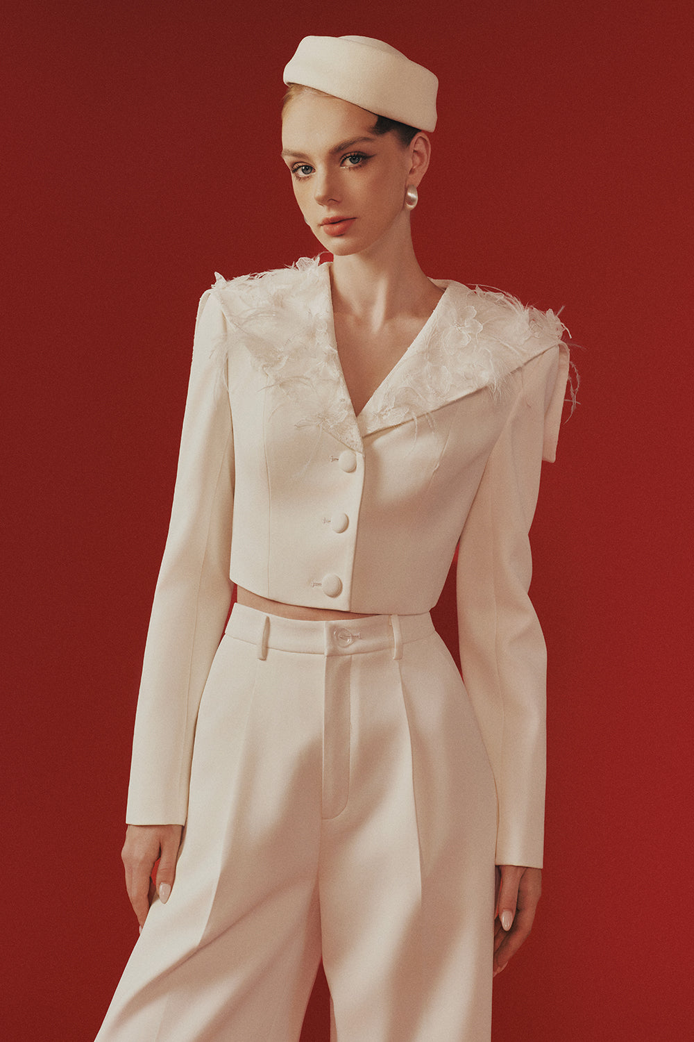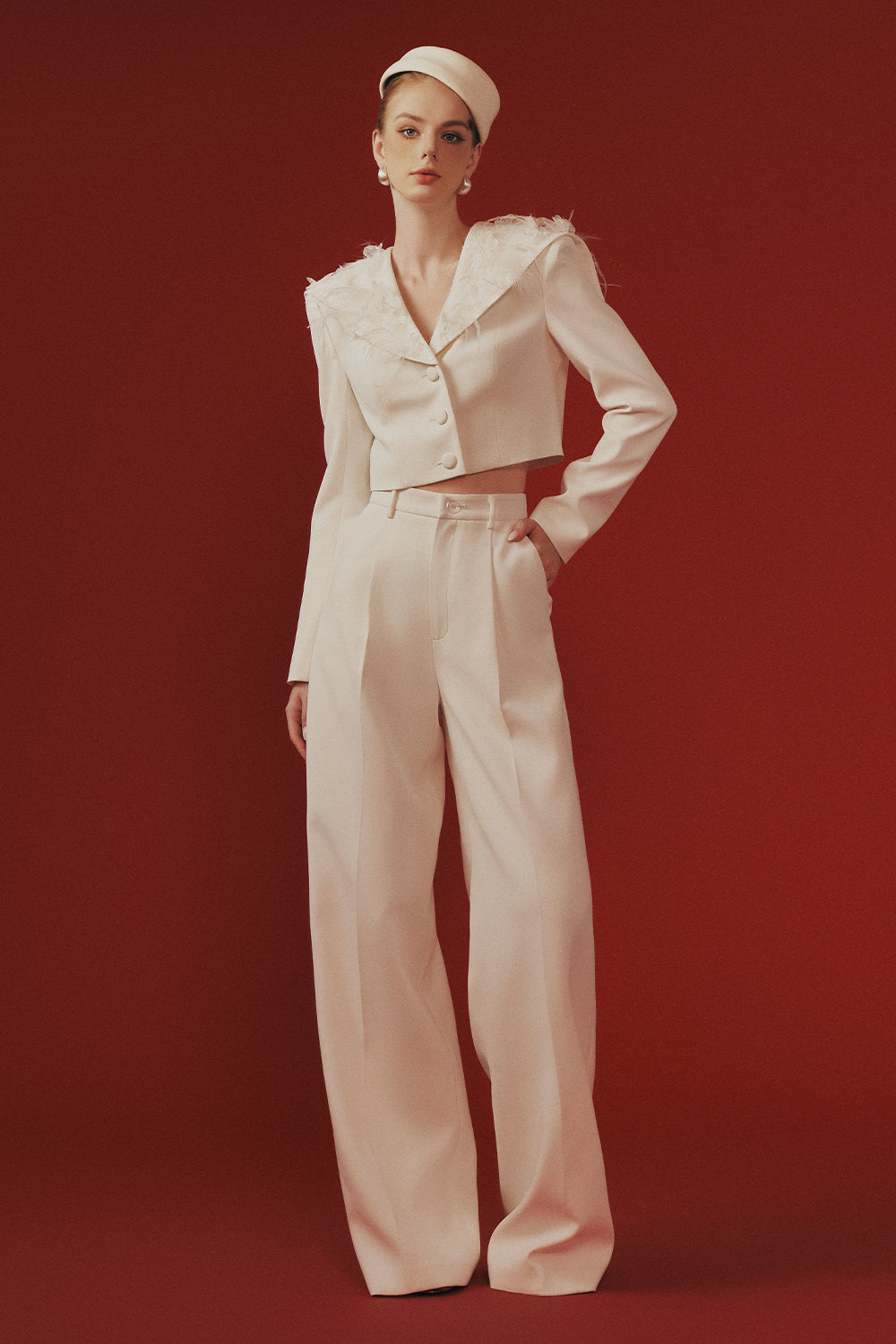 Elevate your wardrobe with this expertly tailored set, featuring a straight silhouette, V-neck, and regular sleeves. Feather embellishments add refined elegance. Perfect for upscale gatherings, evening parties, or stylish events.