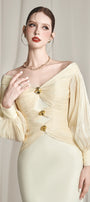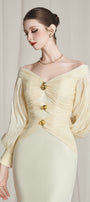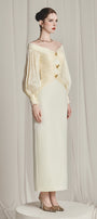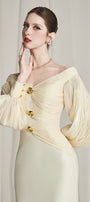 Elevate your wardrobe with this expert-designed midi sheath dress, featuring an off-shoulder neckline, elegant bishop sleeves, and detailed ruching. Metallic embellishments add a modern touch. Perfect for cocktail parties, evening events, or upscale gatherings.