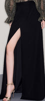 The skirt combines style and sophistication. Designed with a high waist and a floor length slit, it offers a flattering silhouette. Made from crepe material, it provides comfort and durability. Elevate your wardrobe with this must-have skirt.