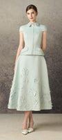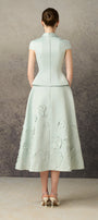 The top showcases a tailored peplum design that flatters the silhouette with structured elegance. Its distinctive flower-shaped collar brings a delicate, artistic flair, complemented by clam-shaped sleeves that add volume and visual interest. Made from lustrous taffeta, this top combines refined texture with architectural details, perfect for sophisticated styling and standout occasions.
