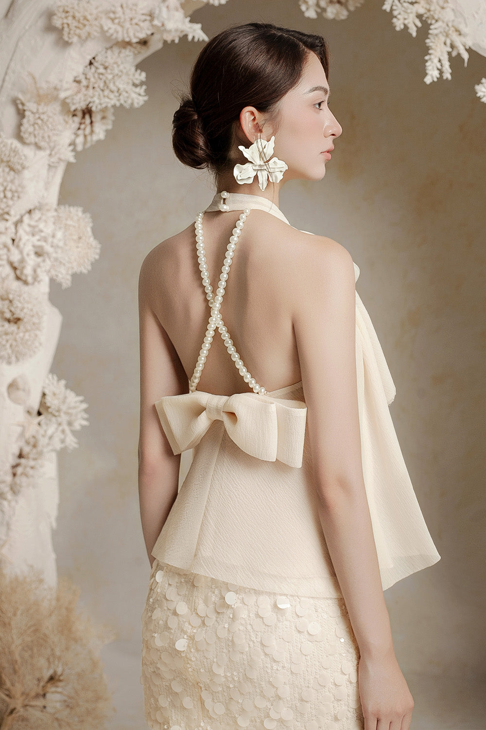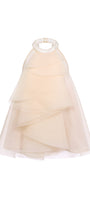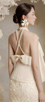 Halter neck with two pearl buttons at the back, Tiered layered front bodice, Open back with criss-cross pearl straps, Fixed oversized bow