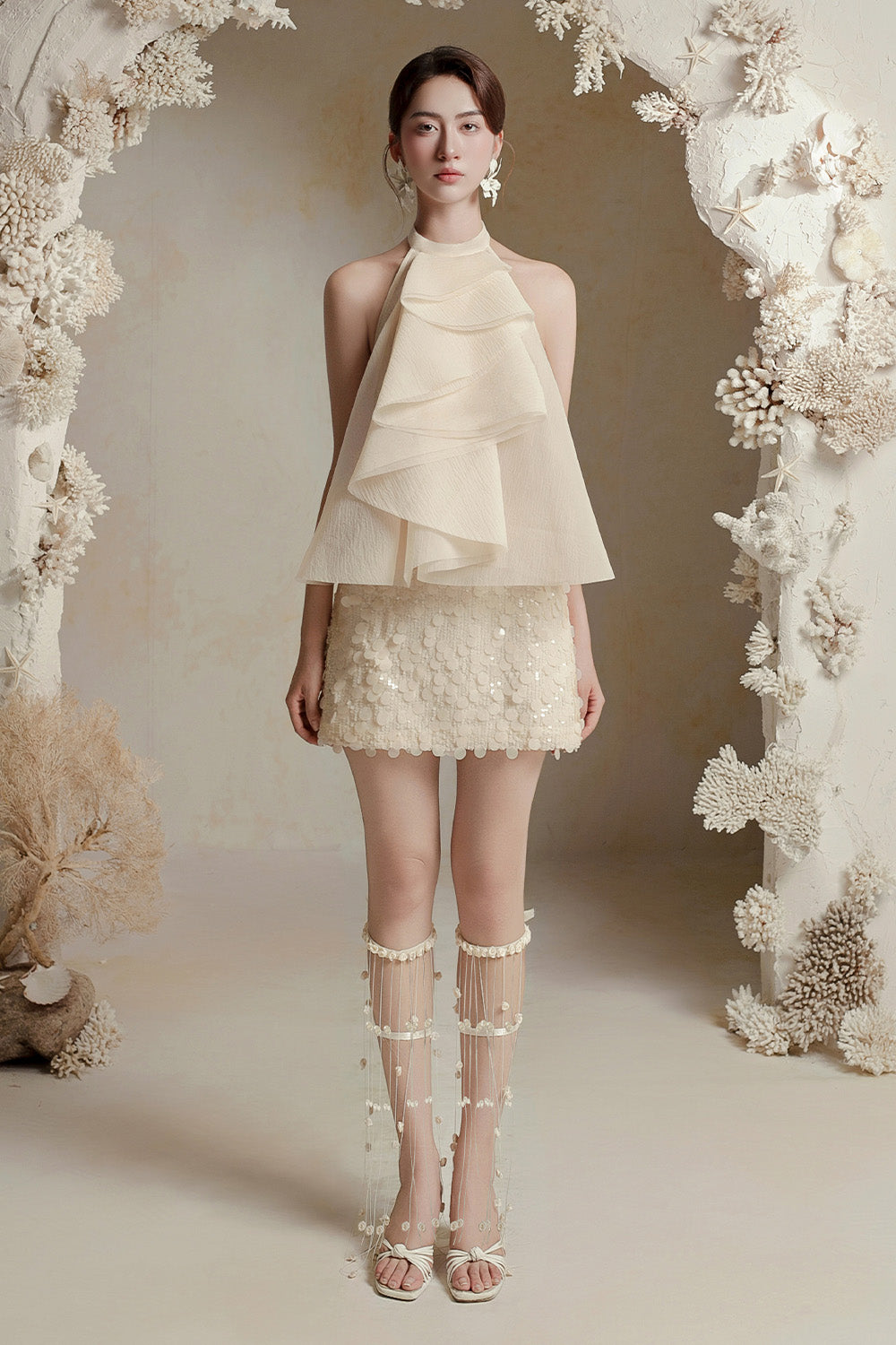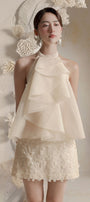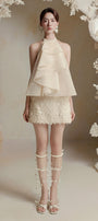 This top features a sophisticated halter-style neckline secured with two elegant pearl buttons at the back. Its slightly A-line silhouette offers a relaxed fit, while the tiered layered front bodice adds dimension and refined texture. Crafted from crinkle organza, this top combines delicate structure with effortless style, making it a versatile piece for elevated, expert dressing.