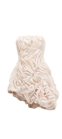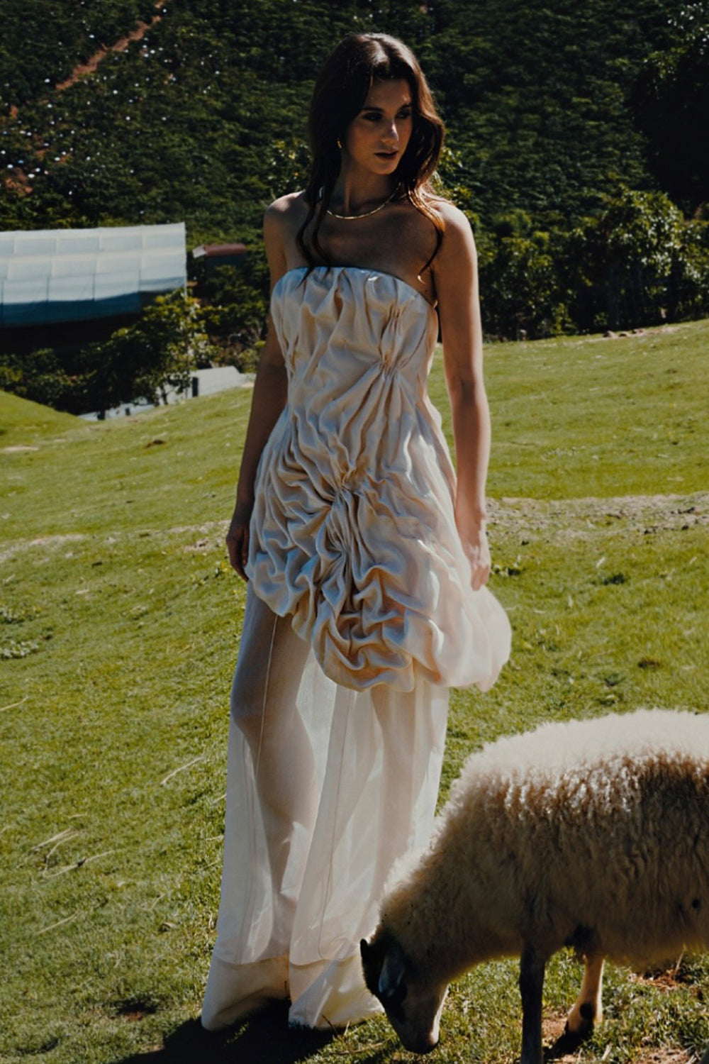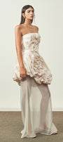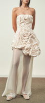 The top showcases refined craftsmanship with its unique asymmetric straight-across neckline. Made from luxurious silk organza, this top offers a crisp, structured silhouette with a subtle translucence that enhances its sophisticated appeal. Its clean lines and expert tailoring make it an ideal choice for elevated occasions, providing a contemporary yet timeless look that effortlessly blends elegance with modern design.