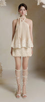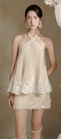 Elevate your wardrobe with the top, featuring a delicate halter neckline that enhances your silhouette. Crafted from lightweight crinkle organza, this top offers a soft, textured feel. The mix lace scalloped hem adds an intricate, feminine detail, perfect for sophisticated layering or standout styling. Ideal for both casual and dressy occasions, it combines elegance with modern design for a refined, expert look.