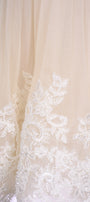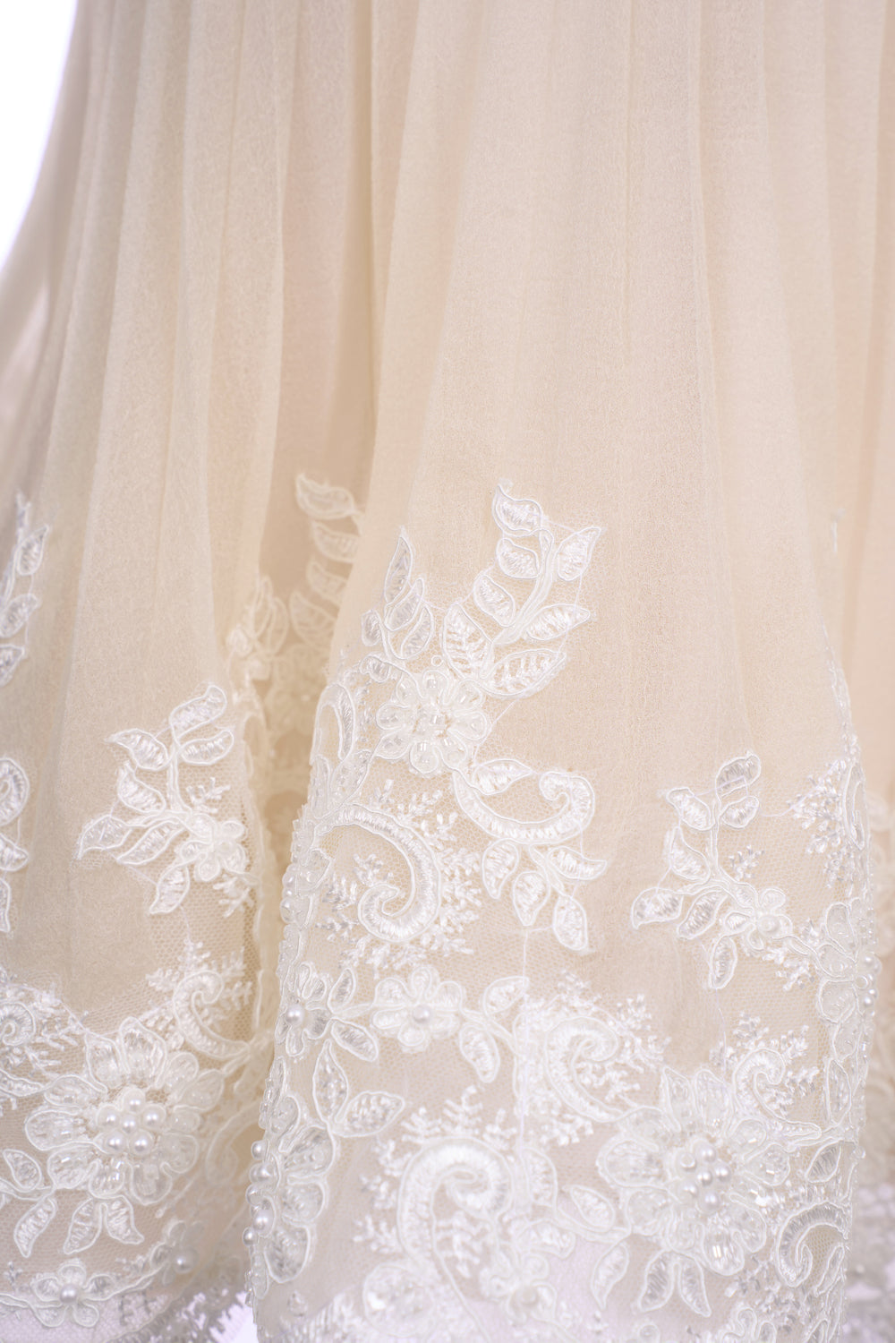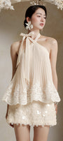 Strap from bust seam can be tied in many styles, Pleated bodice, Wide scalloped lace trim on the hem, Open back, Inner bandeau lining