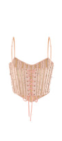 The top features delicate spaghetti straps and structured striped line boning that enhances its silhouette. Crafted from breathable mesh, this top offers a modern, fitted look ideal for layering or wearing solo in warm weather. Its design combines style and support, making it a versatile piece for a confident, fashion-forward wardrobe.