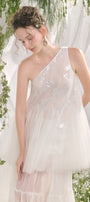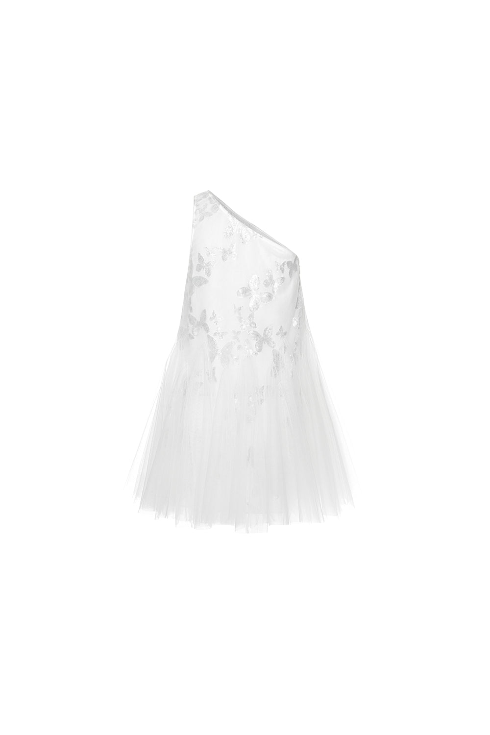 Elevate your wardrobe with the top, featuring delicate butterfly embroidery that adds a touch of whimsy. Crafted from lightweight tulle, this one-shoulder design offers a flattering silhouette with airy comfort. Perfect for layering or wearing alone, it combines elegance with a playful edge for versatile styling.
