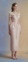 The midi dress features a structured chest cup that enhances silhouette definition, complemented by puffy hips for a flattering shape. Its gathered sheer sleeves with attached floral details add a delicate, sophisticated touch, blending elegance with modern design. Crafted from luxurious taffeta, this midi dress offers both style and refined craftsmanship for standout occasions.