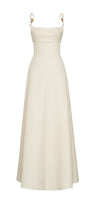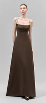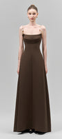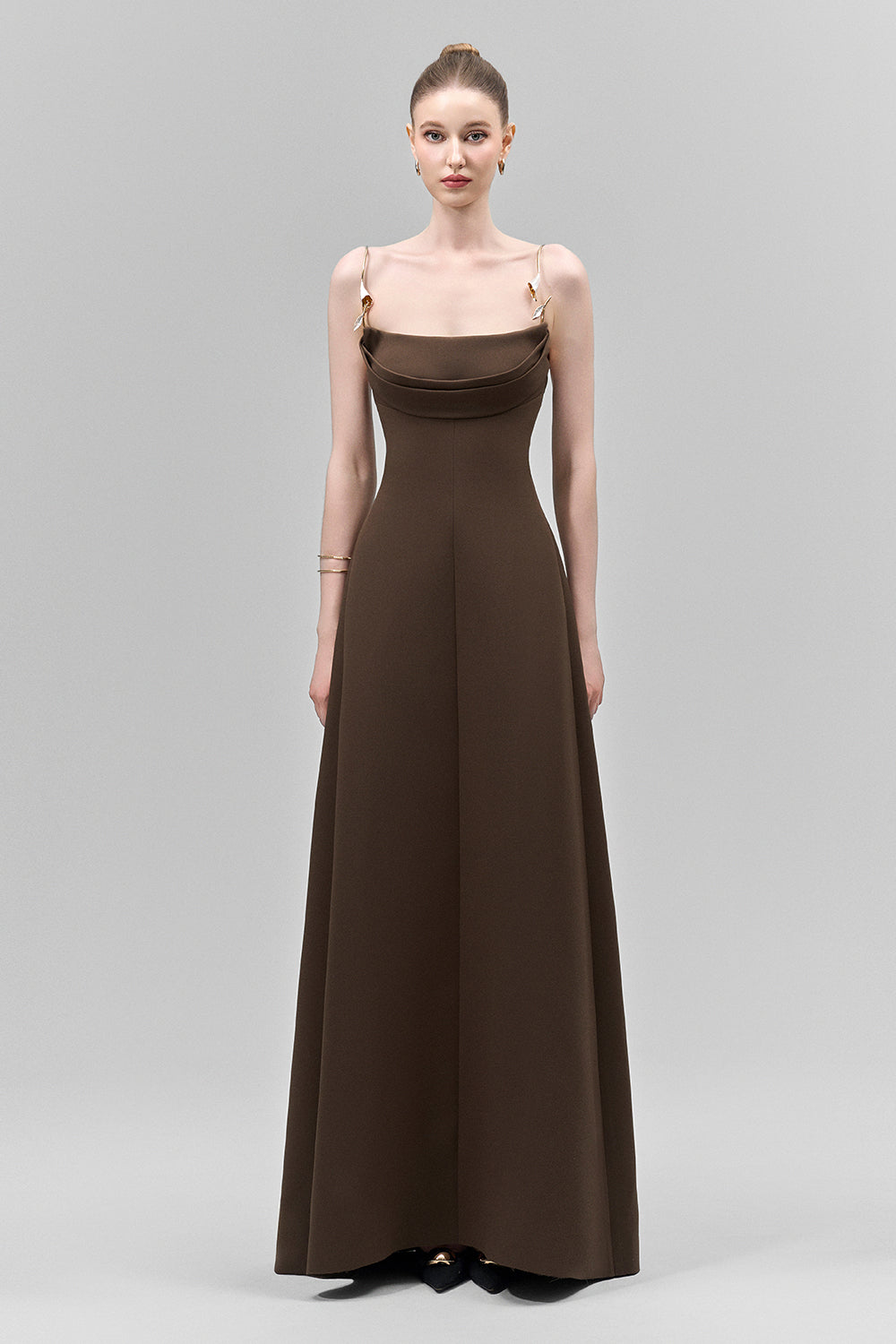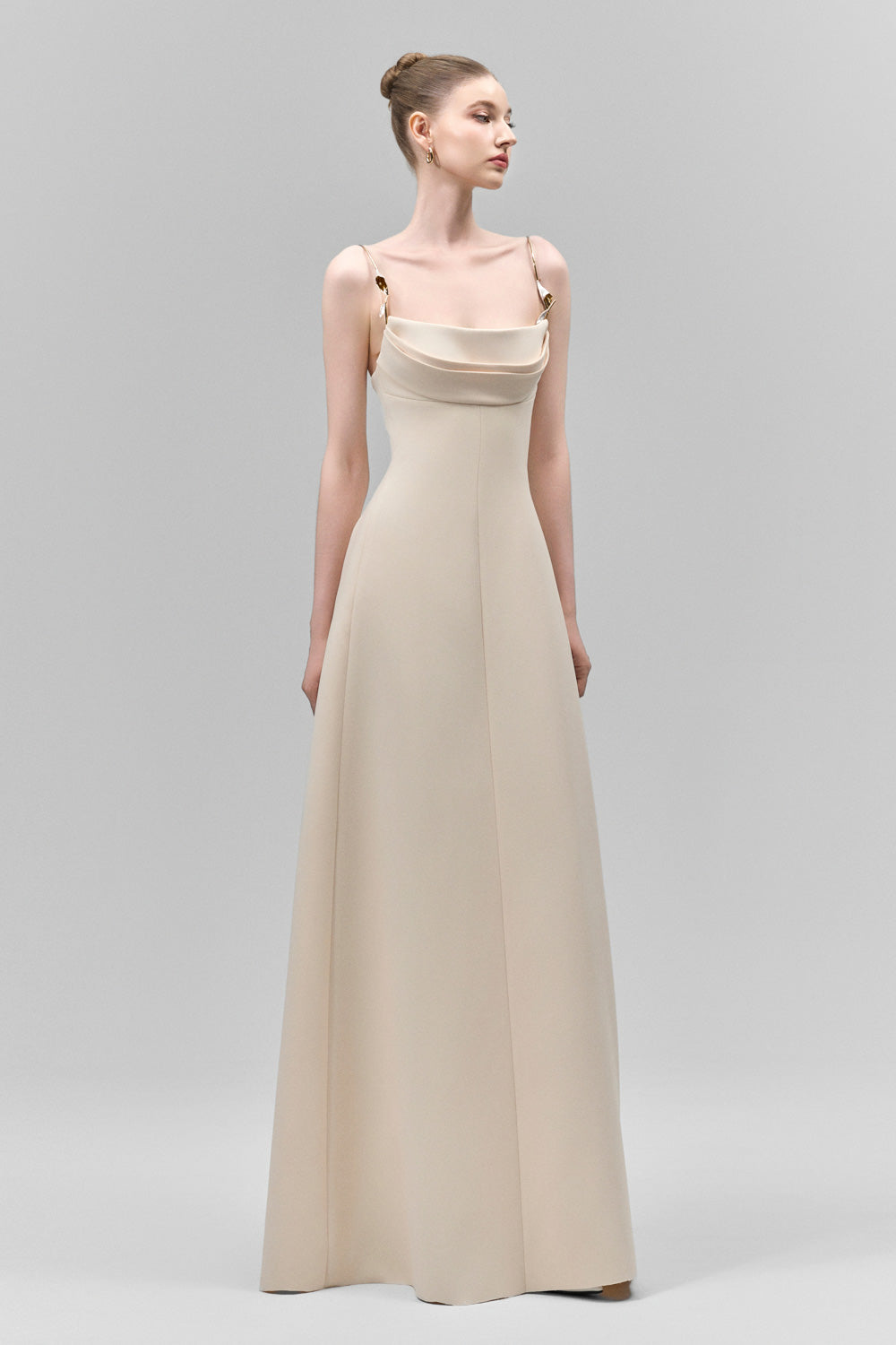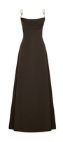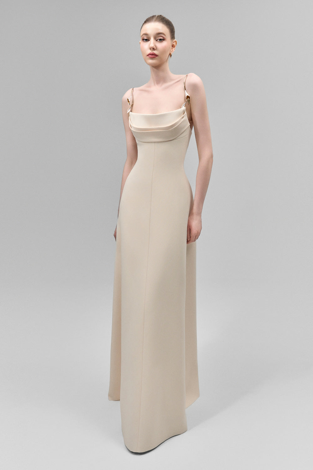 Elevate your evening with this dress, featuring delicate metal straps that drape elegantly across the chest. Crafted from smooth crepe fabric, this silhouette flatters while providing comfortable movement. The cowl neck adds a sophisticated touch, perfect for formal occasions where refined style is essential.