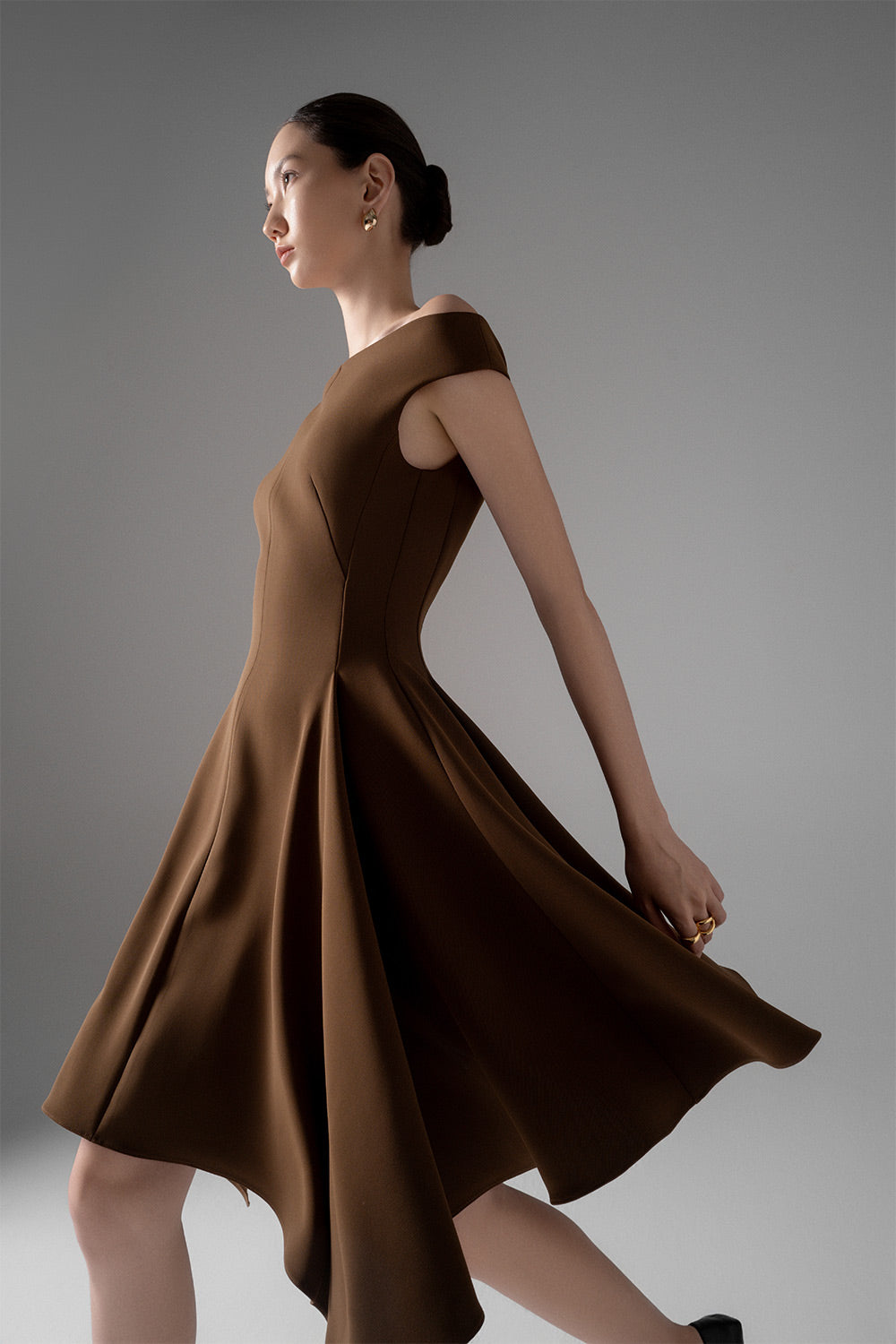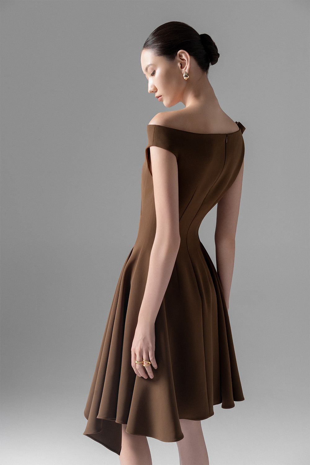 Special Features: Ribbed lines along the dress, Flare ruffle skirt detail, Asymmetric hem, Off-shoulder with a golden button on the side