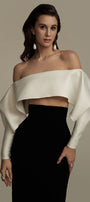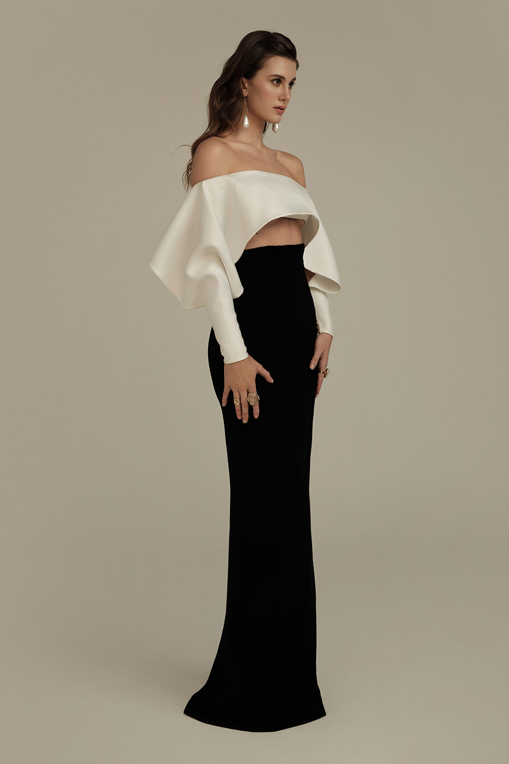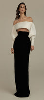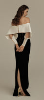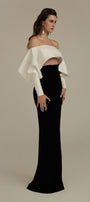 Elevate your evening attire with the set. This sophisticated ensemble features a sleek sheath silhouette with an elegant off-shoulder neckline that accentuates the collarbone. Crafted from premium silk crepe, it offers a luxurious drape and subtle sheen while maintaining breathability. The maxi length creates a statuesque profile, perfect for formal occasions or upscale events where refined elegance is essential.