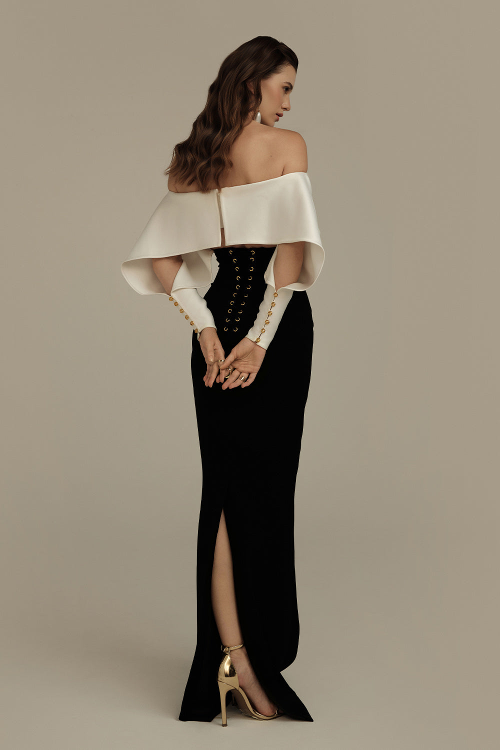 Special Features: Off-shoulder crop-top, High waist slit back skirt with lace up closure, High cuff with golden button line, Split sleeve design