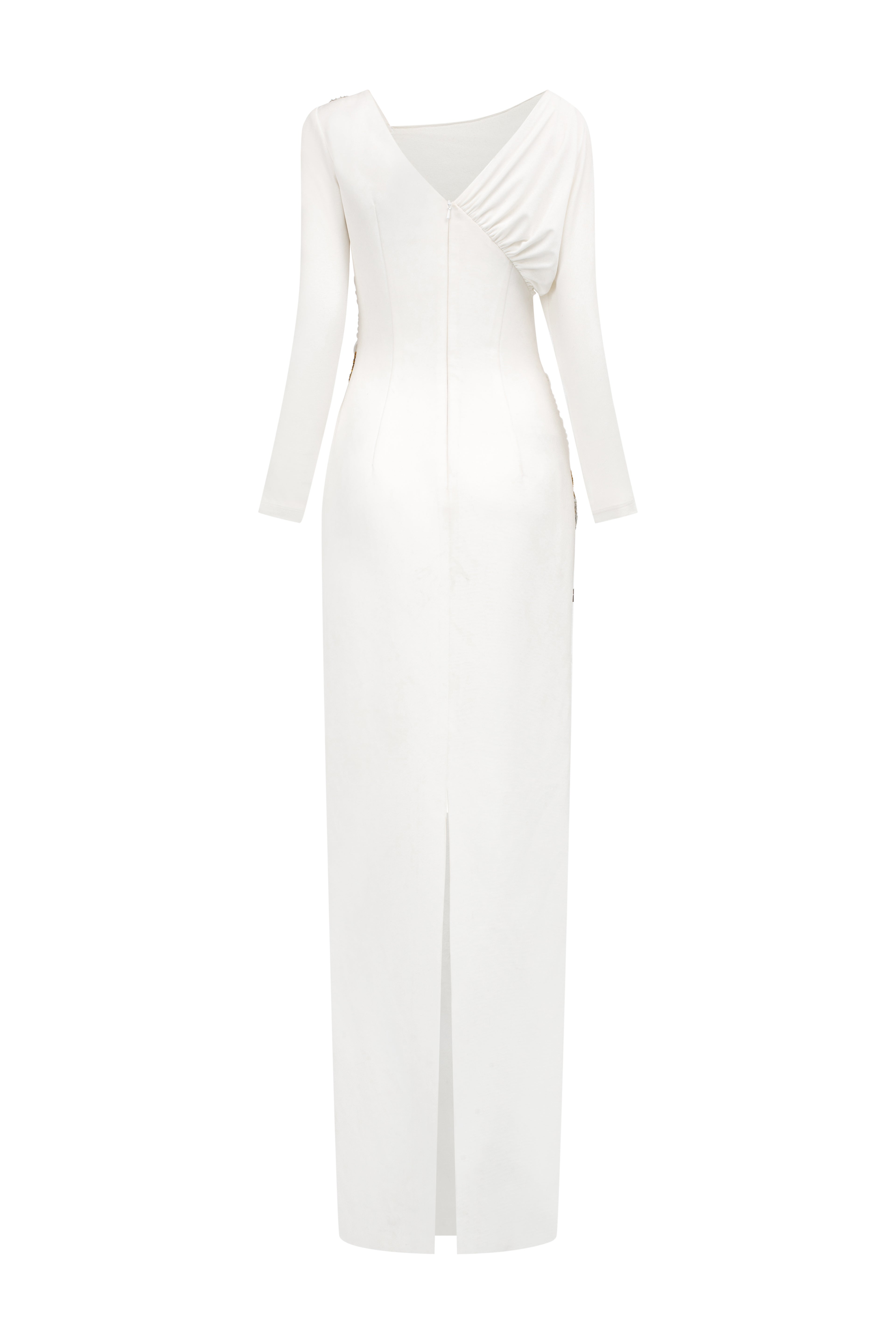 Showcase refined elegance in this sheath maxi dress, featuring an asymmetric neckline, regular sleeves, intricate ruching, and bead embellishments. Designed for a sophisticated silhouette, it's perfect for formal events, weddings, or upscale receptions.