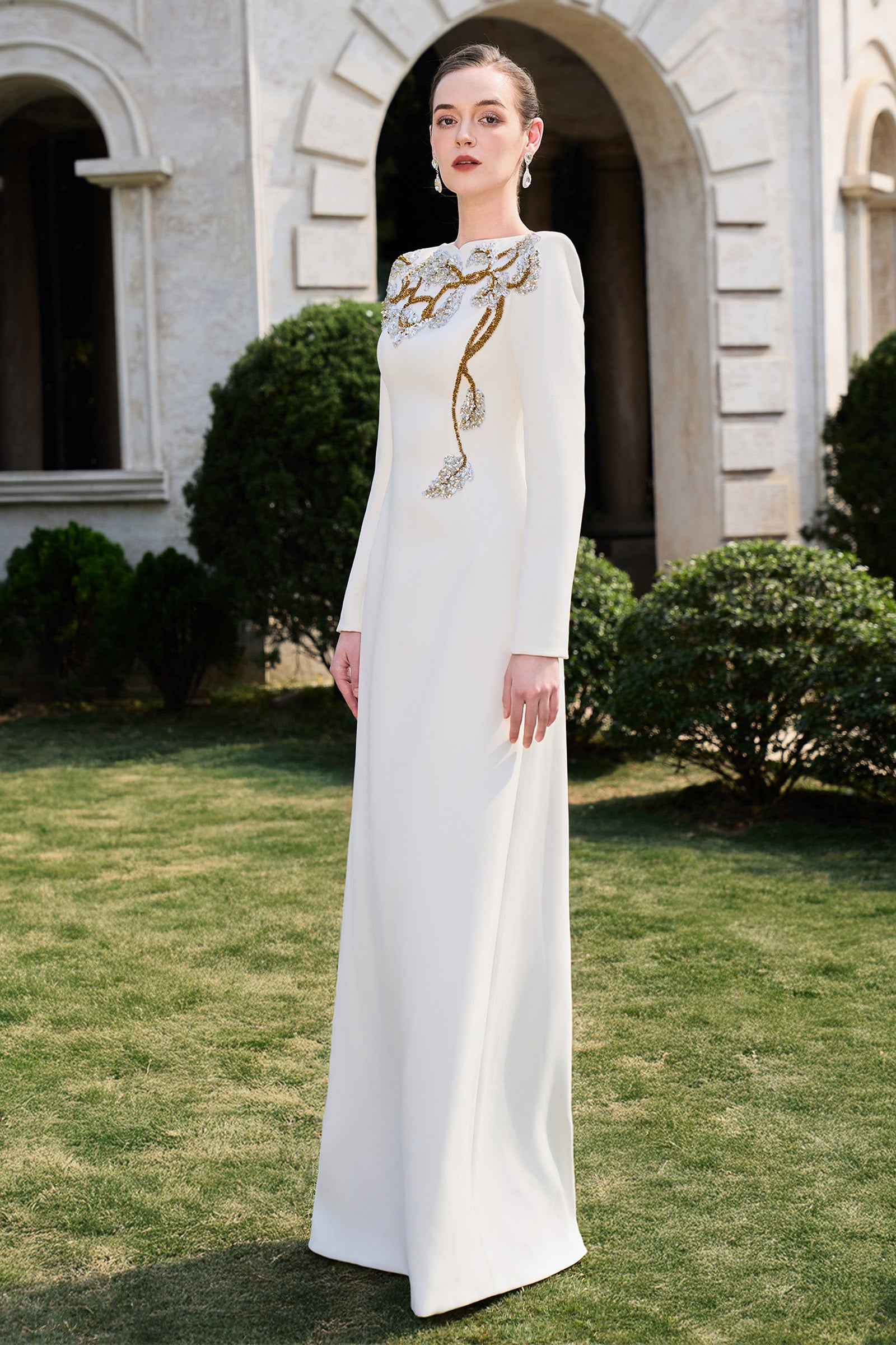 This expertly crafted A-line maxi dress features a graceful boat neck, regular sleeves, and exquisite bead and embroidery embellishments. Designed for elegance and flow, it’s perfect for gala events, evening parties, and formal celebrations.