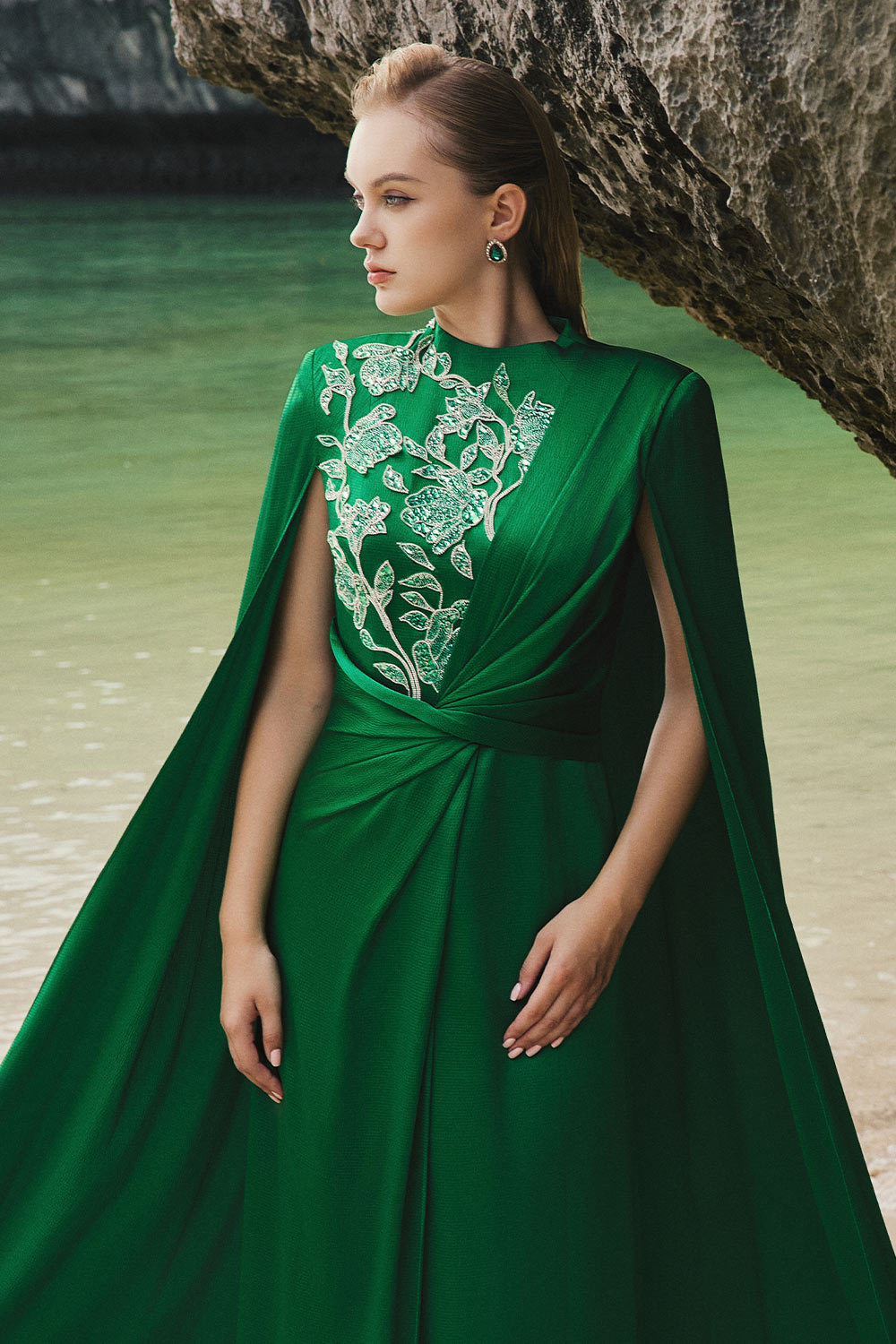 Attached leaf with crystals on the bodies, Twisted at the waist, Slit back cape sleeved