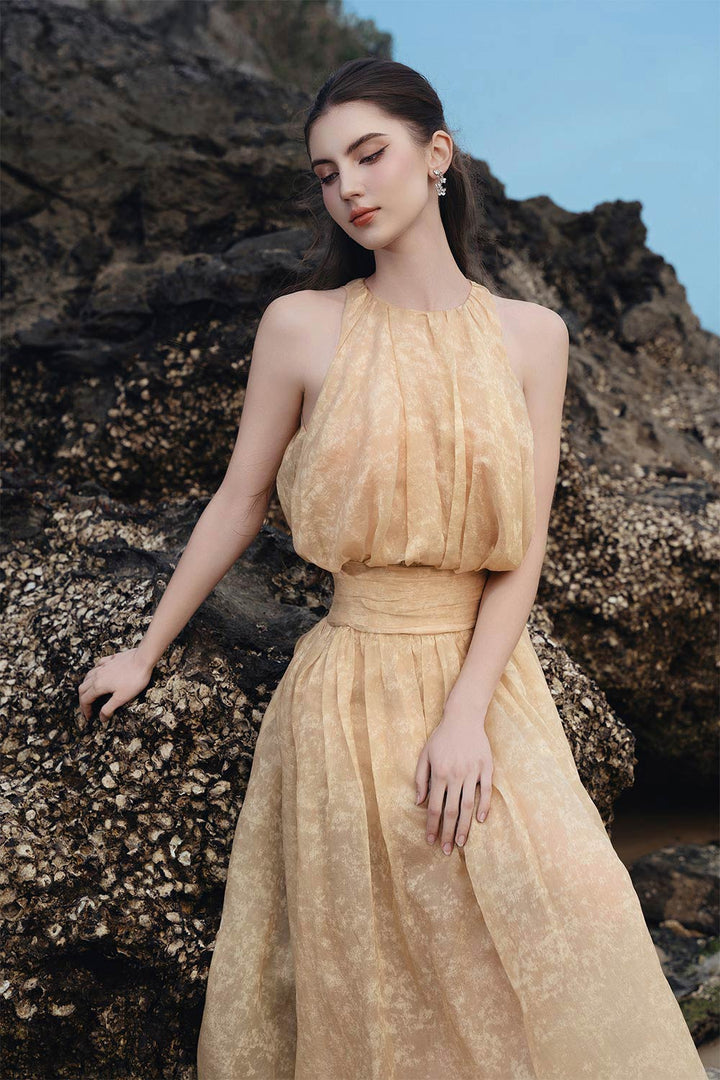 This silk organza midi dress features a blouson halter neck, providing a flattering and comfortable fit. The halter neck draws attention to the shoulders and neckline, while the blouson style adds volume and movement to the dress. Perfect for special occasions or a night out.