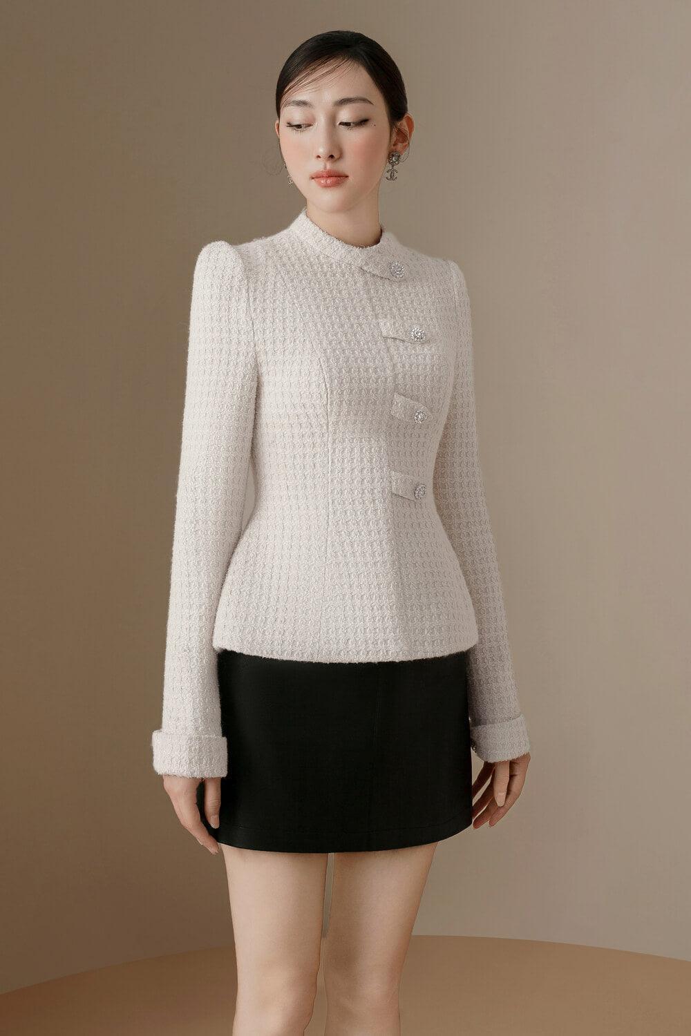 Luxurious and timeless, our top is a must-have for any wardrobe. Featuring a peplum silhouette and long sleeves, this top flatters any figure. Crafted from high-quality tweed, it exudes sophistication and elegance. Elevate your style with this exclusive piece.