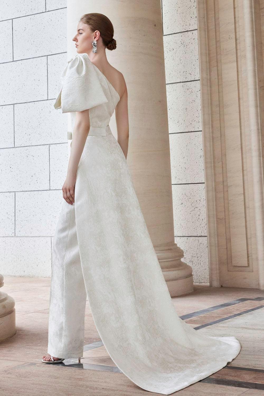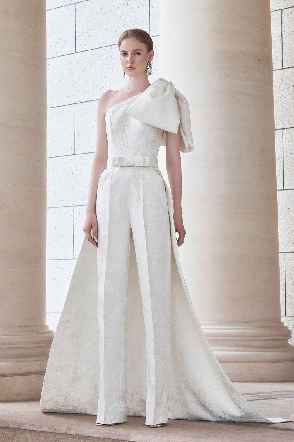 Exaggerated bow on the shoulder, Flexible back flap with hook and eye closure