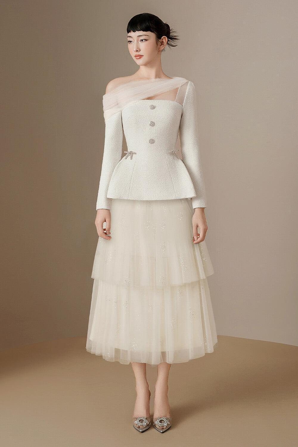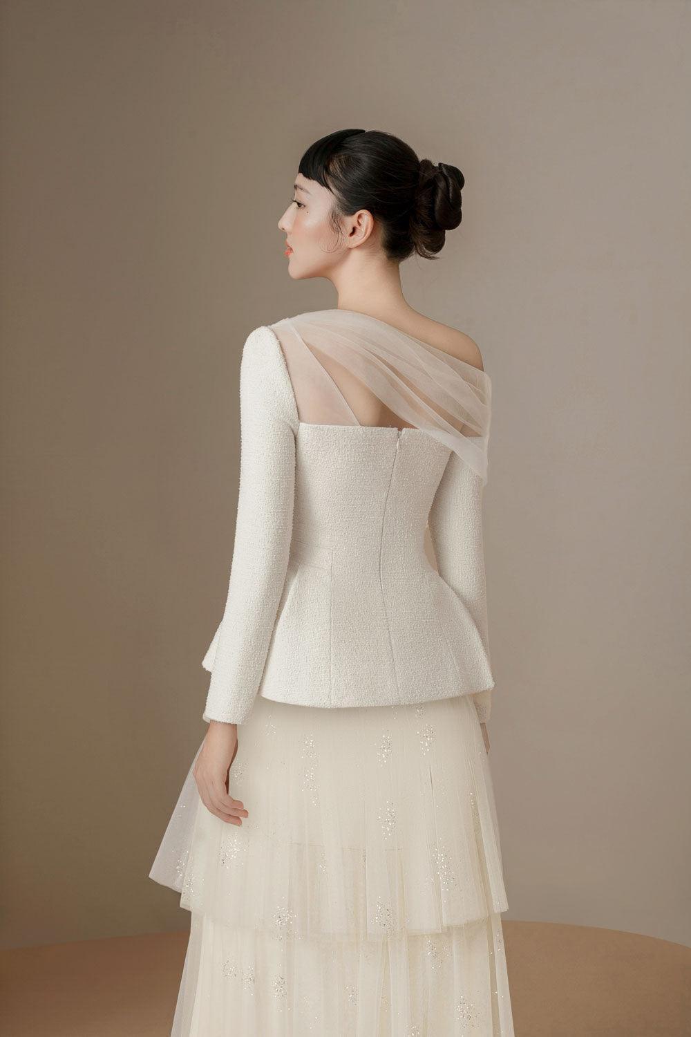 Indulge in luxury with our top. Crafted from premium tweed fabric, this top features an asymmetric sleeve design and an elegant peplum silhouette. Perfect for adding sophistication to any outfit. Elevate your style with Jolie.