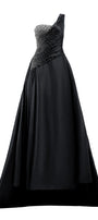 The dress offers a unique and elegant style with its asymmetric one shoulder design and luxurious taffeta fabric. Perfect for formal events, this dress exudes confidence and sophistication. Enjoy the full-length fit and timeless look of this exquisite dress.