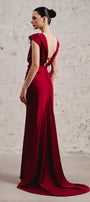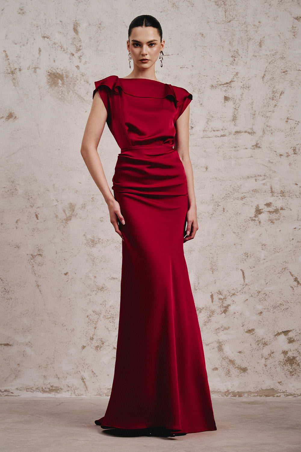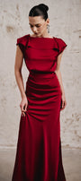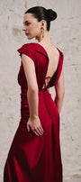 This dress features a sophisticated boat neck and a gracefully draped waist that enhances the silhouette. Crafted from luxurious silk satin, it flows elegantly to the floor, while the open back with delicate string detailing adds a refined, modern touch. Perfect for formal occasions, this gown combines timeless elegance with contemporary design for a striking presence.