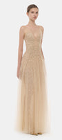 This expert-crafted A-line maxi dress features luxurious brocade material, exquisite embroidery, and meticulous applique embellishments. The elegant V-neck enhances its sophisticated silhouette, making it ideal for weddings, formal galas, or upscale soirées.