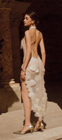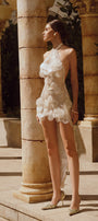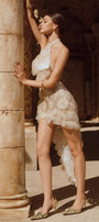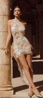 The dress offers a sophisticated silhouette that contours the body with precision. Its halter neck design highlights the shoulders while the high-low hem adds dynamic movement and visual interest. Crafted from breathable mesh fabric, this dress balances allure and comfort, making it an expert choice for elegant evening events or stylish occasions.