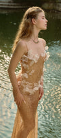 The dress offers a sleek sheath silhouette enhanced by a see-through design adorned with sequins, creating a striking balance between elegance and boldness. This maxi-length gown captures attention with its shimmering details while maintaining a streamlined fit that flatters the figure. Ideal for evening events, it combines sophisticated glamour with contemporary style.