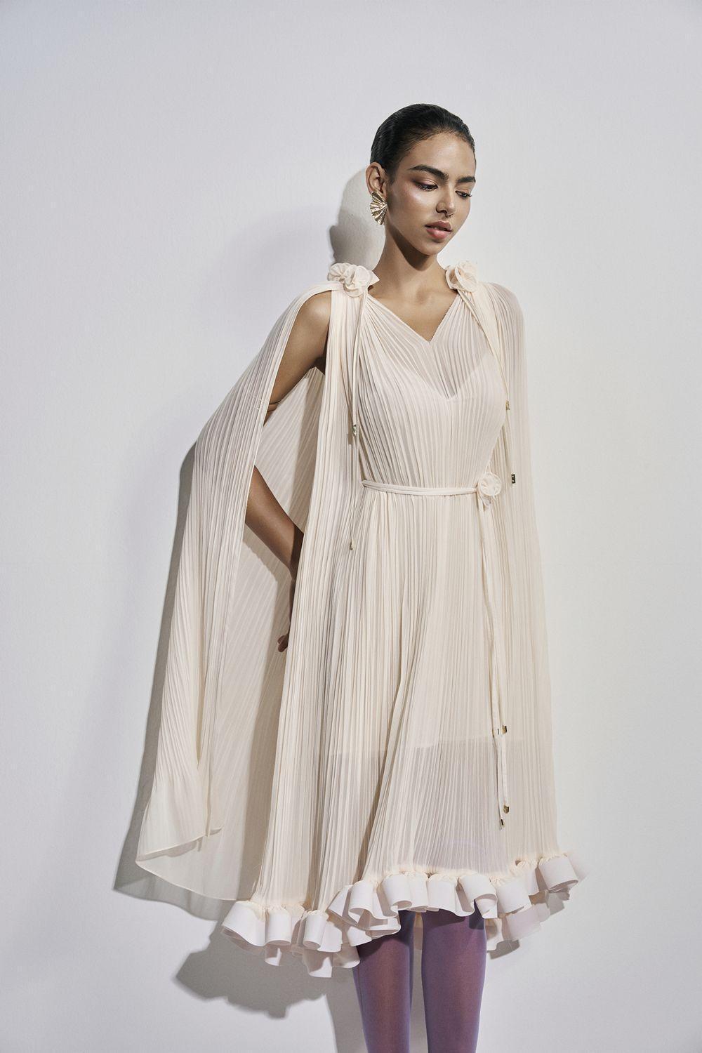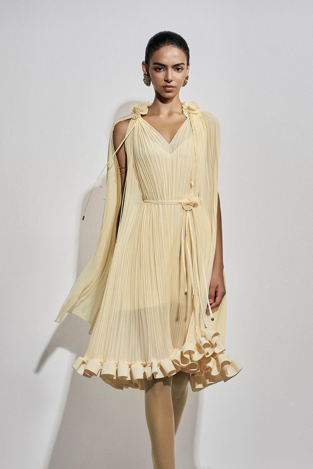 Gathered entired the dress, Asymmetry of the front and back flaps, Ruffle trim along the hem, 3D flowers attached on the shoulder, Asymmetric cape shoulder