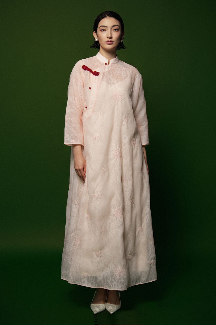 This dress is a perfect blend of traditional and modern style. Made from high-quality organza fabric, this dress features a unique Trapezoid Mandarin Neck design and falls elegantly to ankle length. It's lightweight, breathable, and comfortable, making it perfect for any occasion.