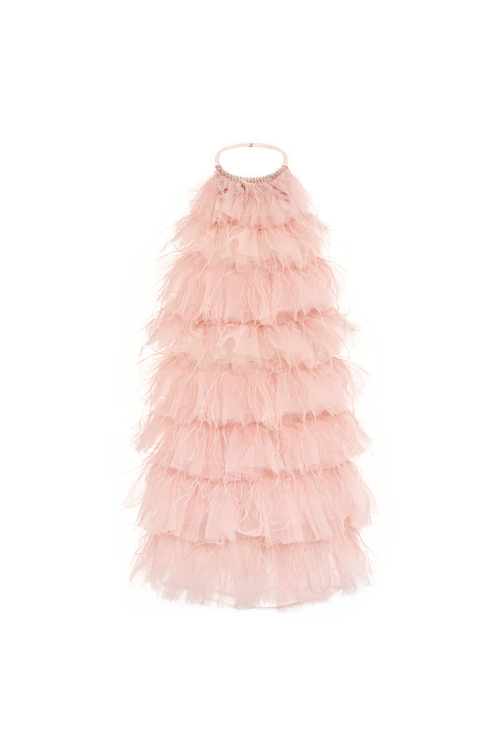 | Special Features | Tiered layers, Feathered design on halter neck, Open back |