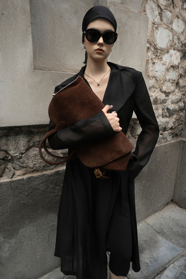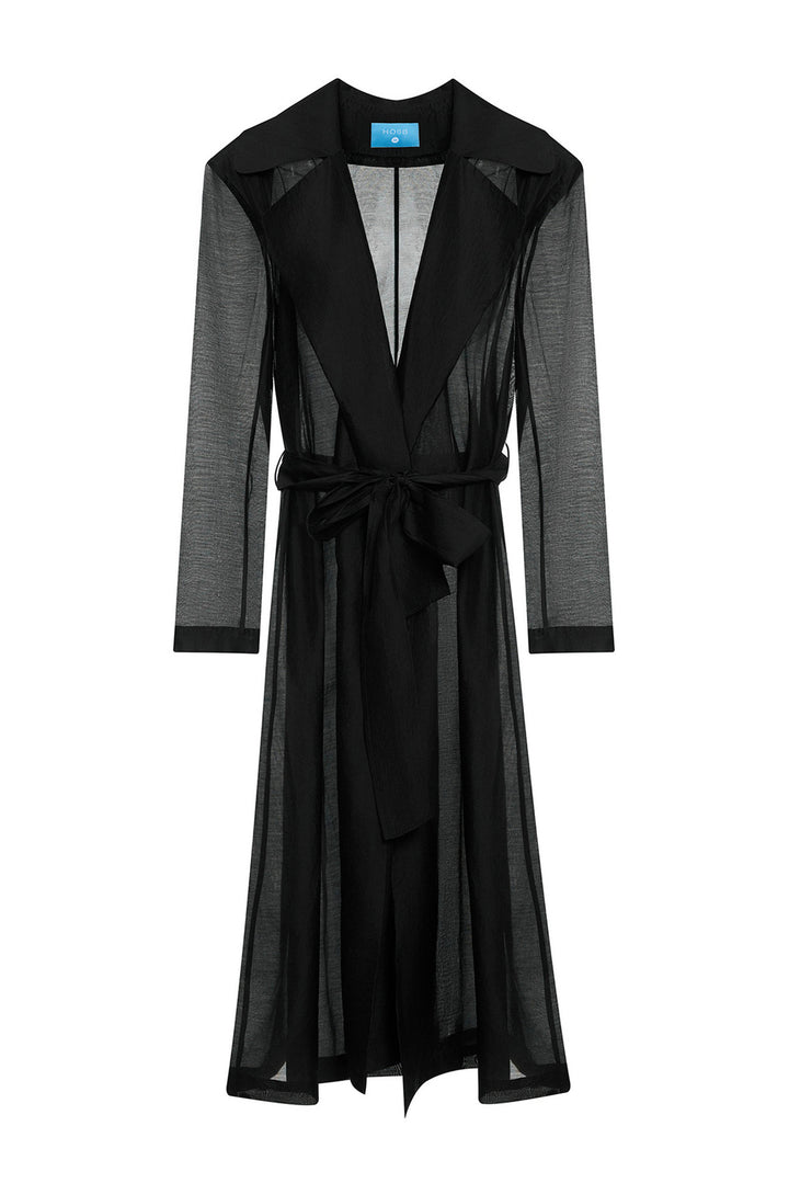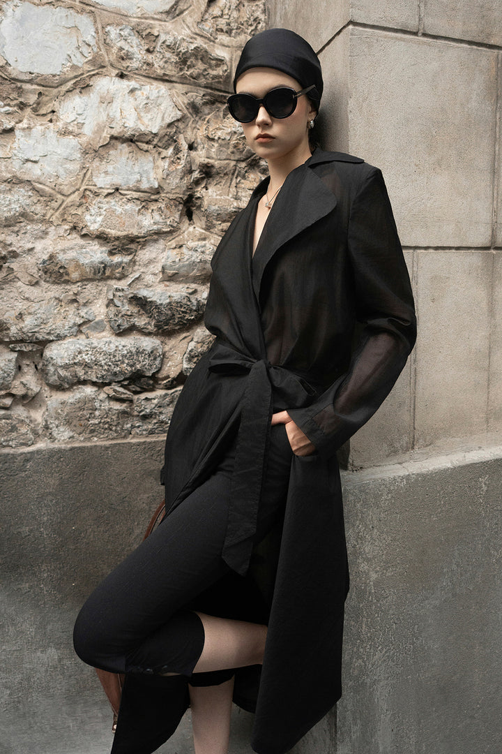 This jacket features a sheer design with a large lapel, offering a sophisticated silhouette. Crafted from rayon, it falls gracefully to calf length, combining comfort with elegance. The matching fabric belt cinches the waist, enhancing the tailored fit and adding a refined finishing touch. Ideal for layering, this jacket balances lightweight breathability with polished style.