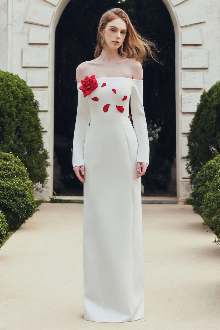 Special Features Split cuffs, Dart line along the dress, Red falling rose applique on the top, High slit back