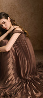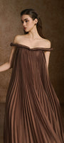 This maxi dress features a delicately pleated bodice that enhances its elegant silhouette. Crafted from lightweight silk organza, it offers a graceful drape and subtle sheen. The off-shoulder design adds a refined, contemporary touch, making it ideal for formal occasions where sophistication and comfort are paramount.