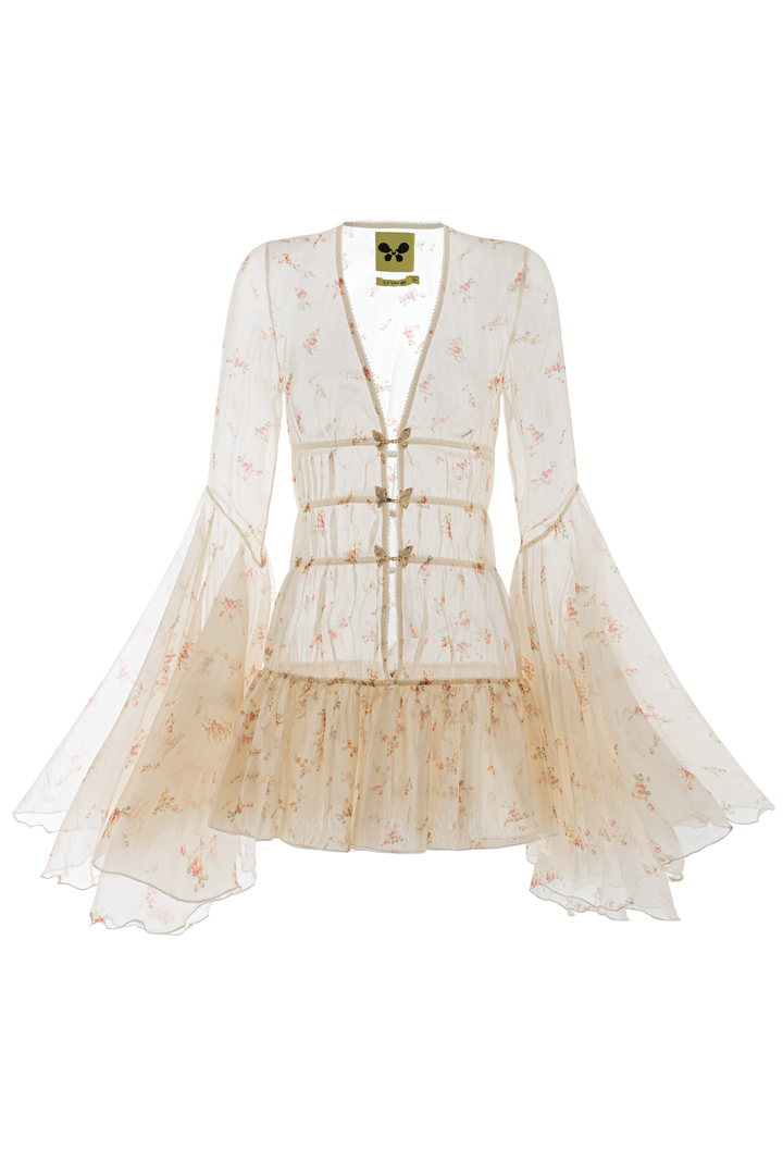 Florentine Drop Waist Flute Sleeved Sheer Fabric Extra Short Length Dress