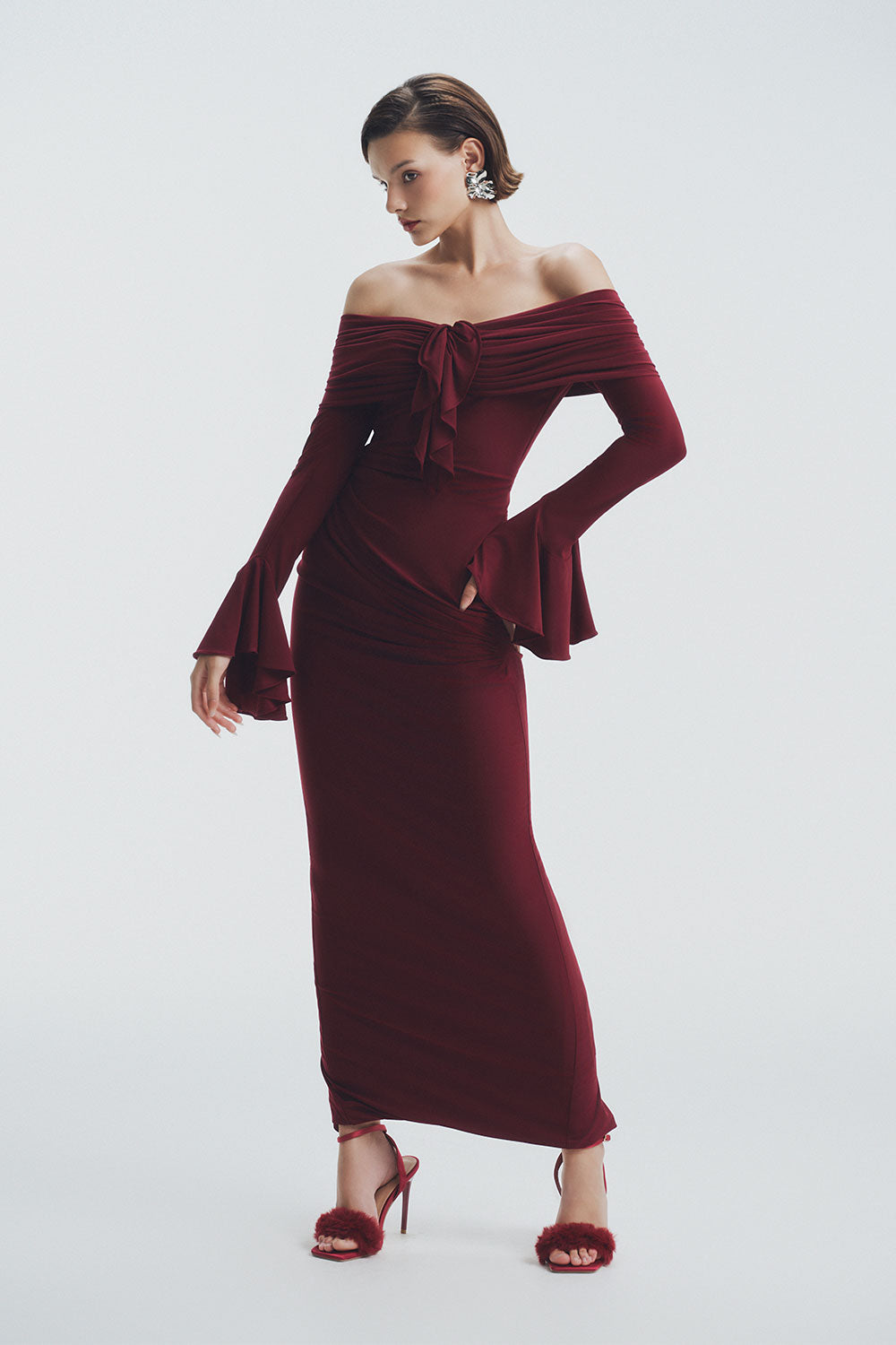 Made with spandex fabric, it offers a bodycon fit and an elegant off-shoulder design. The ankle-length adds a touch of sophistication, making it a must-have for your wardrobe.