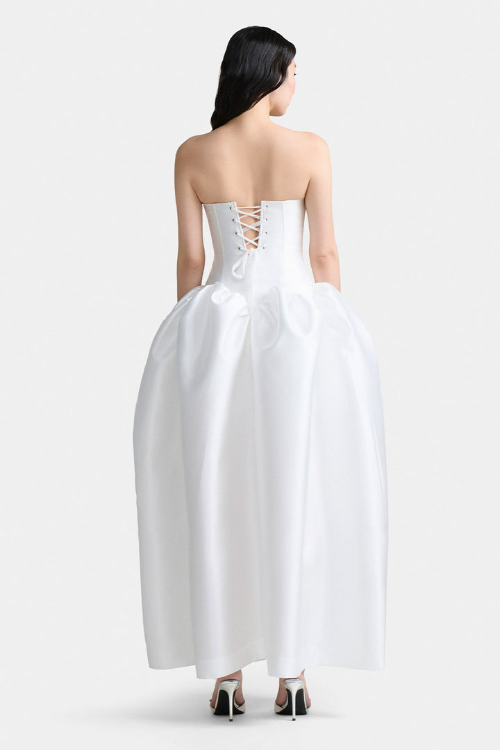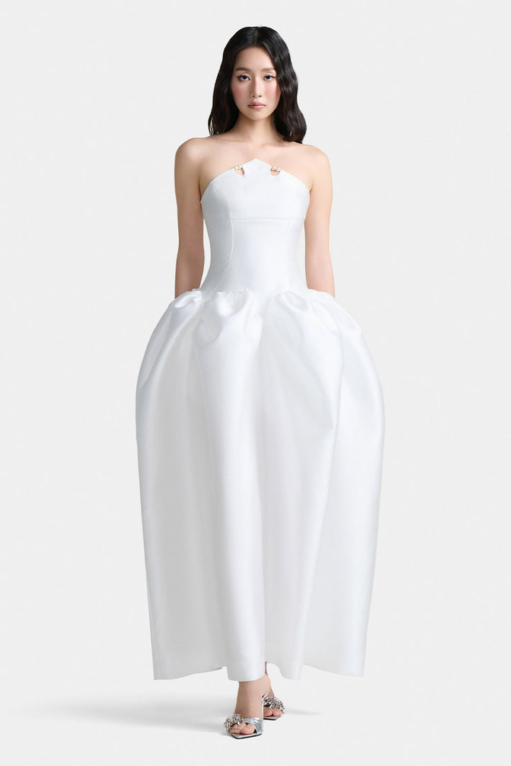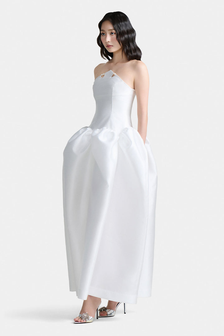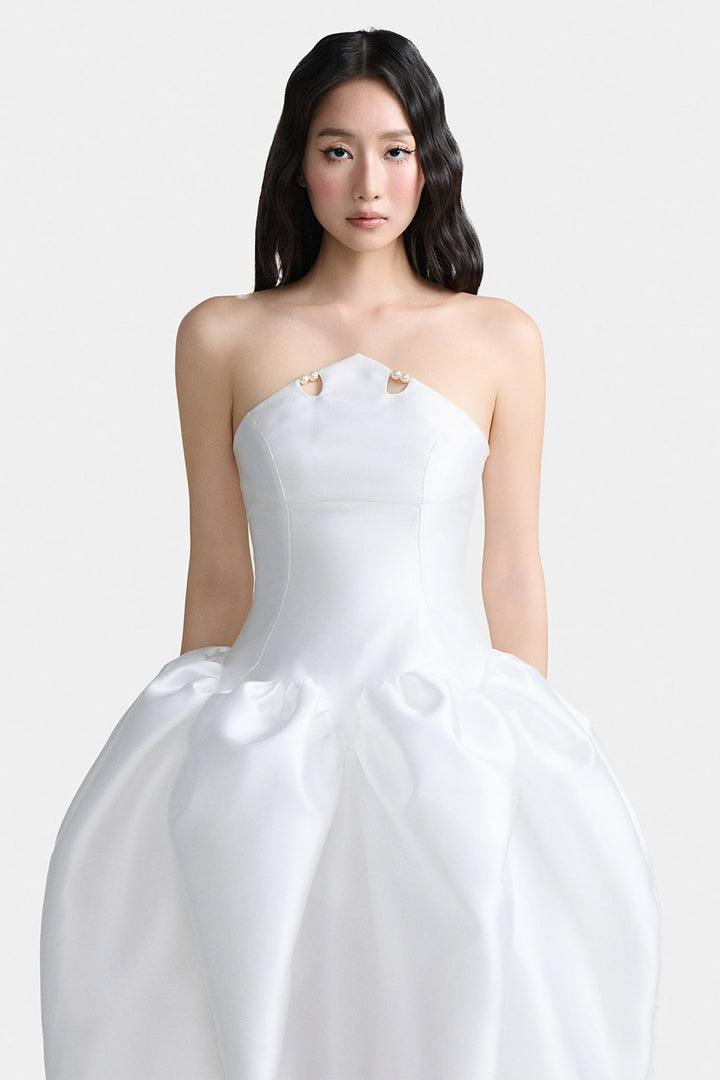 | Special Features | Corset tie back, Puffed hem, Pearl decoration, Pointed front flap |