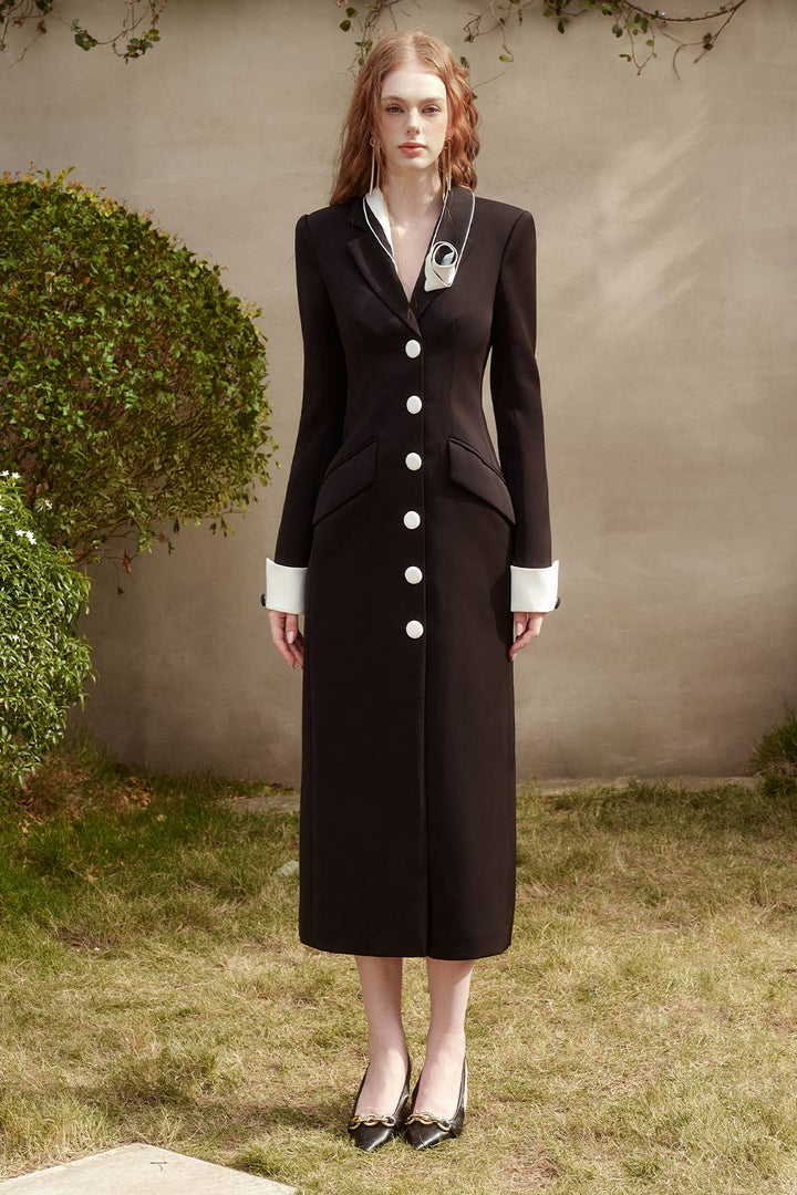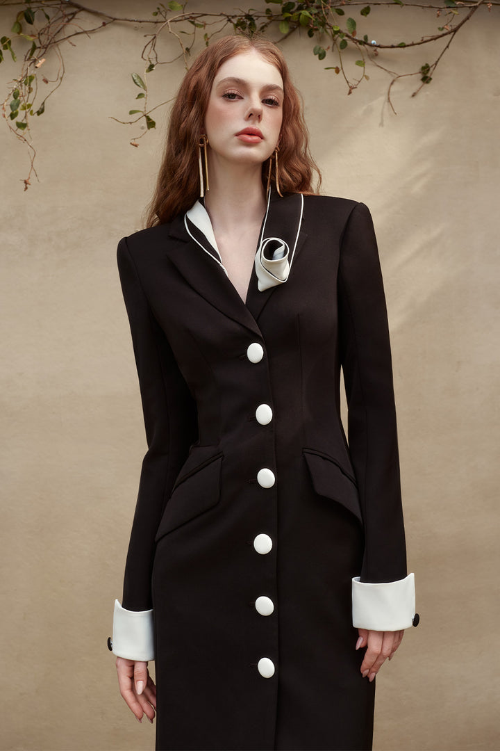Special Features Reverted slit cuffs sleeves with black button, Single breasted with white button, Attached floral on the collar, Two-color contrast