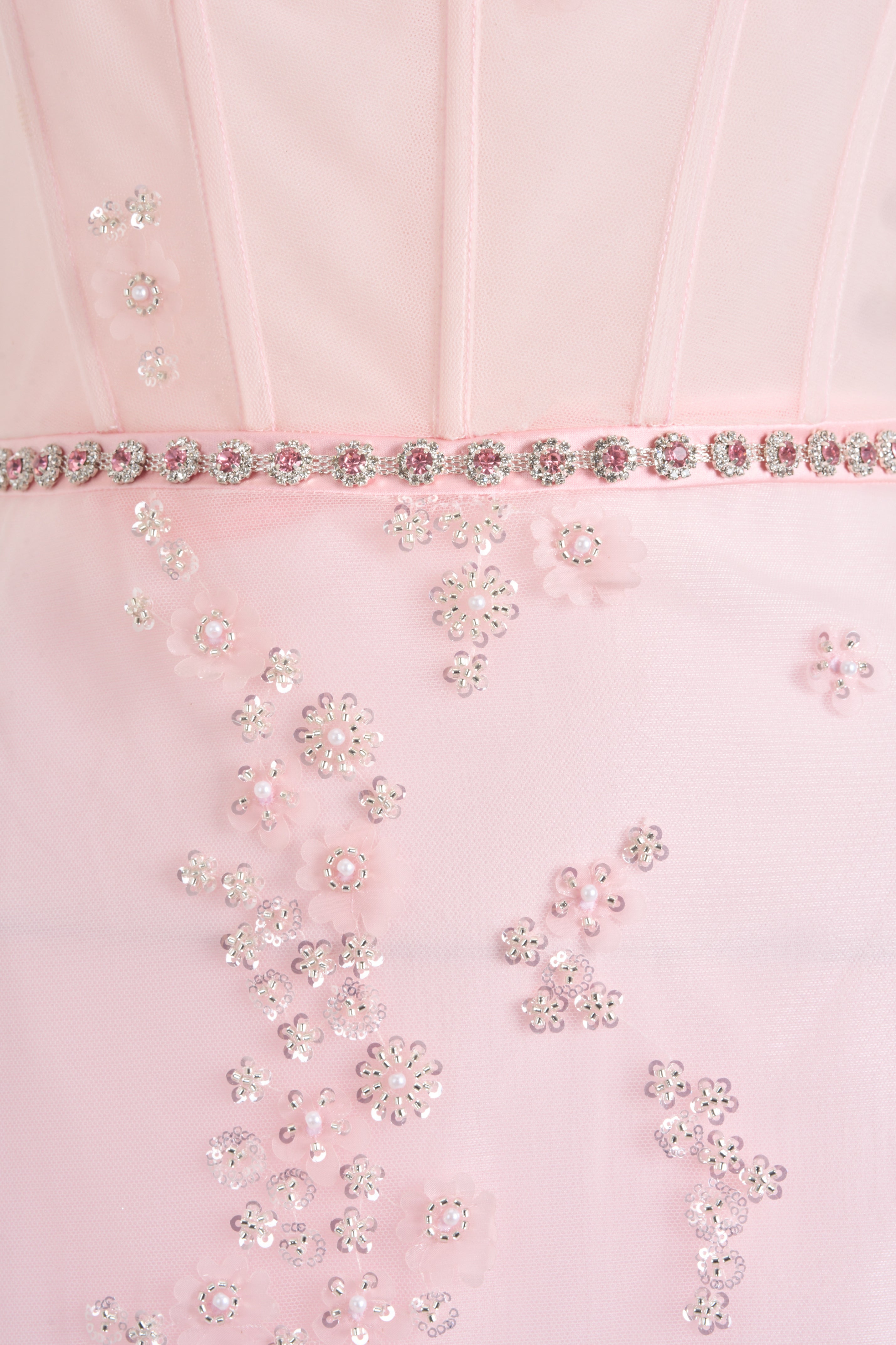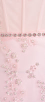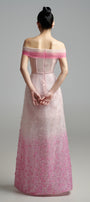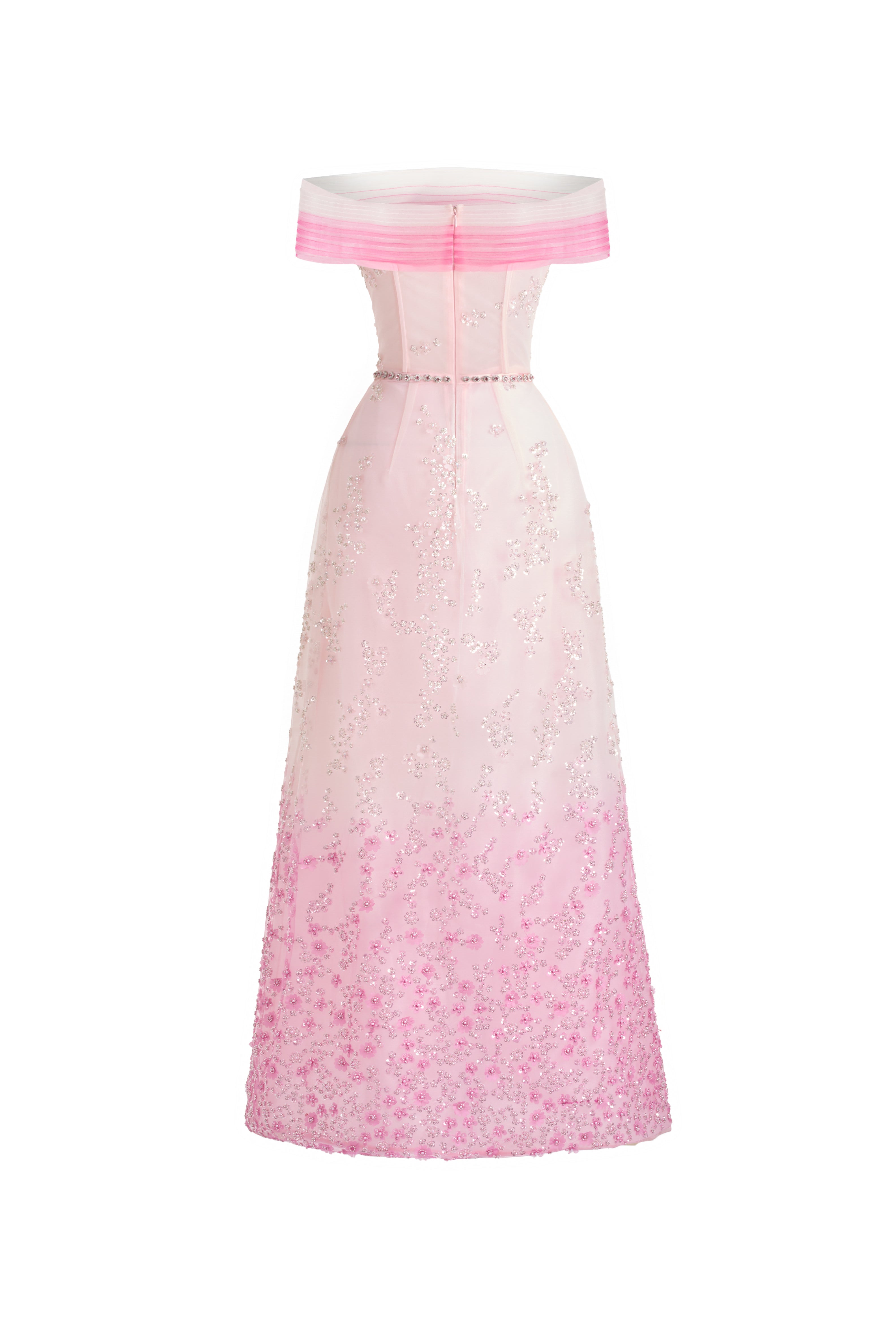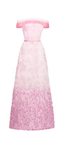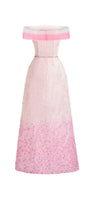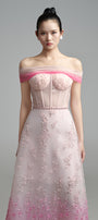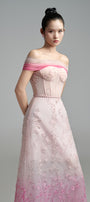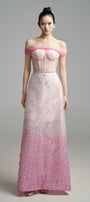 This strapless maxi dress features a striking tonal gradient of deep to soft pinks flowing seamlessly from the shoulders to the hem. The lower portion is adorned with intricate, delicate embellishments that add a sophisticated yet captivating detail, perfectly balancing refinement with visual impact.