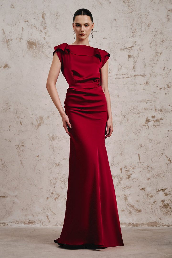 This dress features a sophisticated boat neck and a gracefully draped waist that enhances the silhouette. Crafted from luxurious silk satin, it flows elegantly to the floor, while the open back with delicate string detailing adds a refined, modern touch. Perfect for formal occasions, this gown combines timeless elegance with contemporary design for a striking presence.