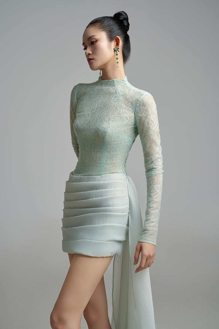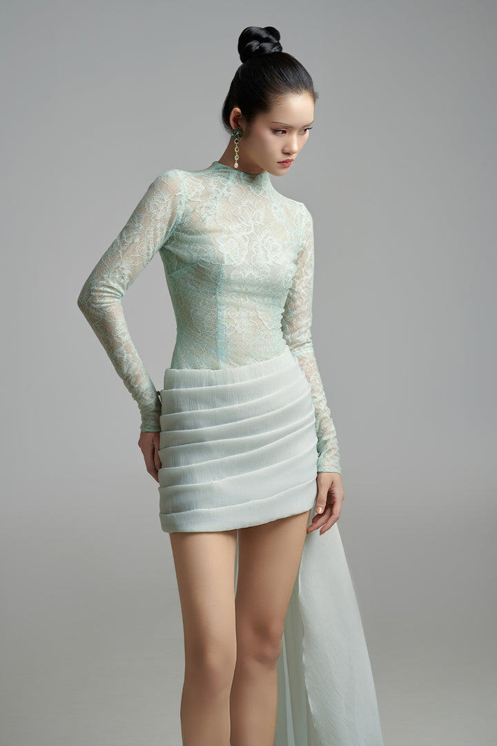 A harmonious interplay of tones between the tailored mini skirt and the long-sleeved lace top creates a look that is both delicately feminine and effortlessly bold. The ensemble balances elegance with ease, offering comfort without compromising style. The standout feature is the flowing overskirt, which adds a touch of refined grace, making this design equally suited for both upscale events and more understated occasions.